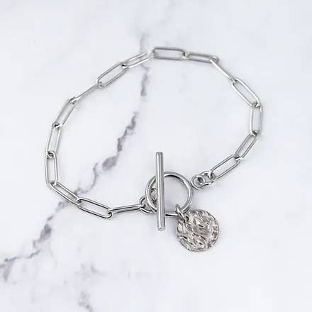 Bracelet à maille rectangulaire fine avec un fermoir Slash zéro (toggle) et avec une pampille martelée de 15mm en acier inoxydable.