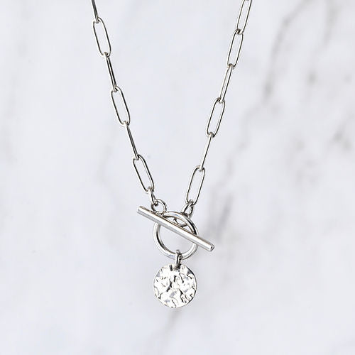 Collier "Inaya", d'une longueur de 50 centimètres avec des mailles rectangulaires et avec une pampille martelée de 15mm montée sur un fermoir toggle. Il se mariera très bien avec le bracelet "Inaya".