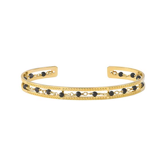 Bracelet jonc ajustable avec perles déclinables. Inspiration ethnique indienne et malaisienne, voyagez de New Delhi à Kuala Lumpur avec nos chaines perlées aux couleurs estivales. Plaquage or 1µ 18Kt Fabriqué en France. Bijoux en base Laiton avec plaquage or 18K pour des bijoux hypoallergéniques et ne laissant aucune trace sur la peau. Toutes les étapes de la création, du design à la fabrication sont effectuées en France dans le respect des normes de la bijouterie française.